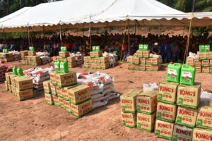 Neatly arranged within the venue were stacks of food items: bags of rice lined up in clean rows, five-litre gallons of vegetable oil reflecting the morning sun, and packets of seasoning cubes placed beside them. Every item had a destination. Every package represented a family.